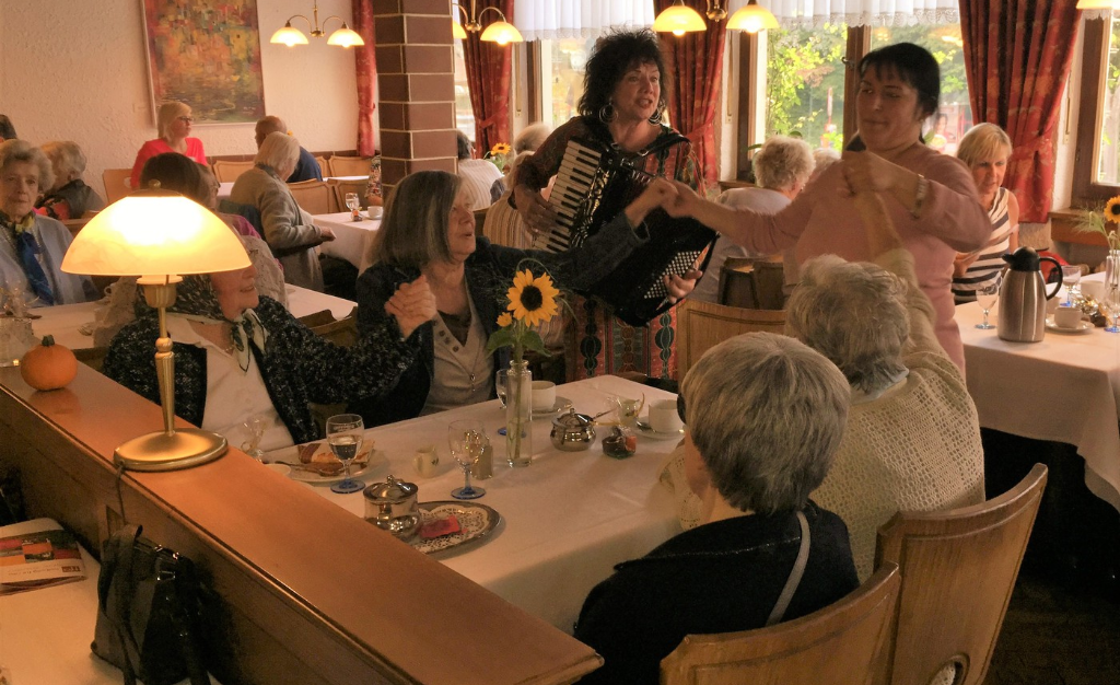 Anita Morasch begleitete den Nachmittag wieder mit ihrer kräftigen Stimme und den mitreisenden Klängen ihres Akkordeons. Sie ging von Tisch zu Tisch und stimmte Lieder an, die viele mitsingen und -schunkeln konnten. Die Stimmung war so gut, dass sogar die eine oder der andere Besucher ein Tänzchen wagten.